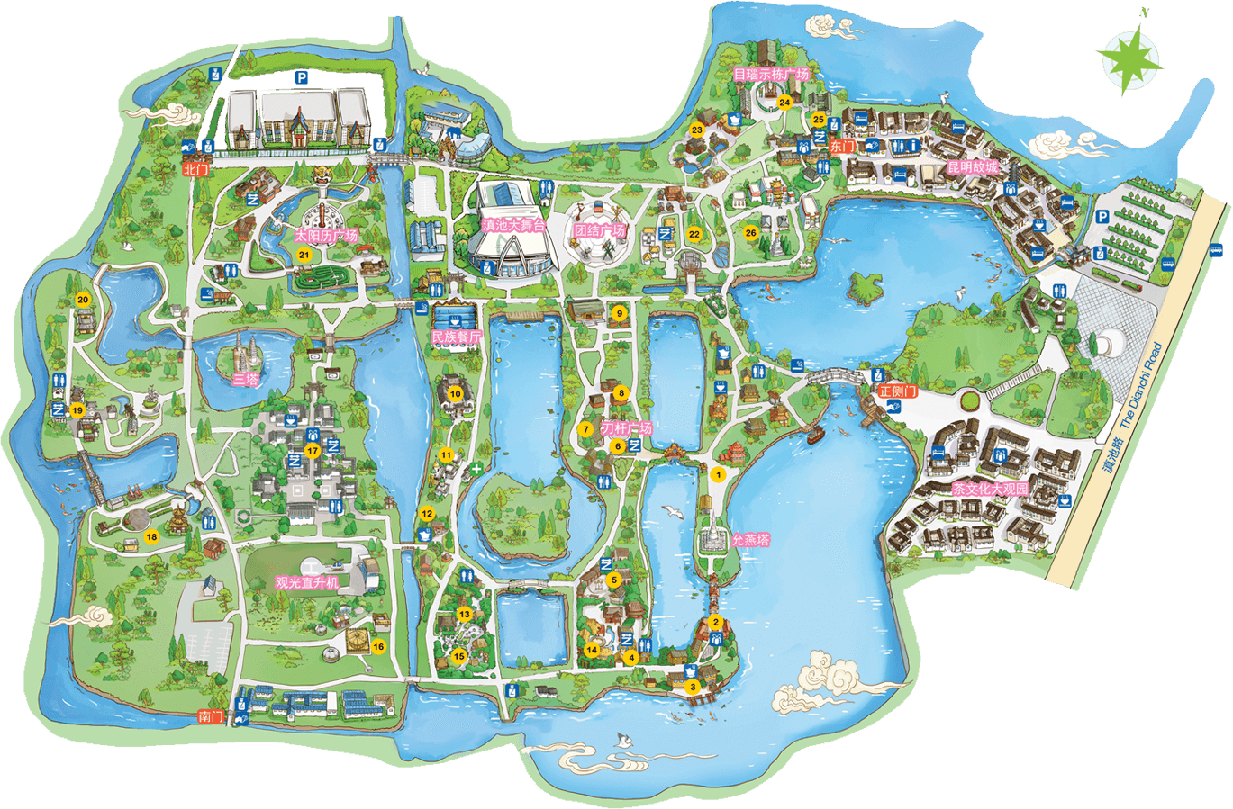 佤族人口約36萬,主要聚居在云南省瀾滄江南段以西的阿佤山區(qū)。佤族寨位于“翠漪洲”東南角。寨內(nèi)分布有茅草頂?shù)母蓹谑浇ㄖ?、牛頭廣場、神靈廣場、司崗里石雕以及糧倉等。牛頭廣場是佤族古老的剽牛活動場所,場正中的牛角為佤族的寨樁,廣場前的兩個石人分別為佤族的男性和女性祖先。神靈廣場表現(xiàn)了佤族萬物有靈、靈魂不死的自然崇拜觀念。場中兩個石人雕像分別為佤族最崇拜的“木依吉”和“阿依娥”。佤族木鼓舞節(jié)拍鮮明強烈,...